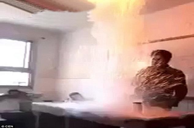 Mảnh kính và những tia lửa bay khắp lớp học. Ảnh: CEN