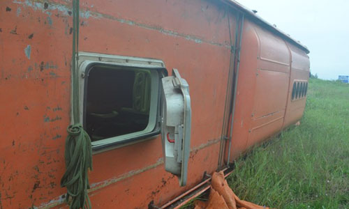 | Chiếc xe bị lật nghiêng nên một số hành khách đã mở cửa, chui lỗ thông gió trên trần xe để ra ngoài. |