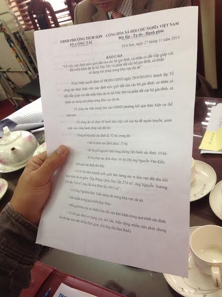 Theo như lời chủ tịch UBND phường Tích Sơn th́ từ năm 2011-2012, phường đă mời các hộ gia đ́nh lên làm việc và kư thỏa thuận không lấn chiếm đất công, trong đó có cả hộ gia đ́nh ông Hà Ḥa B́nh.