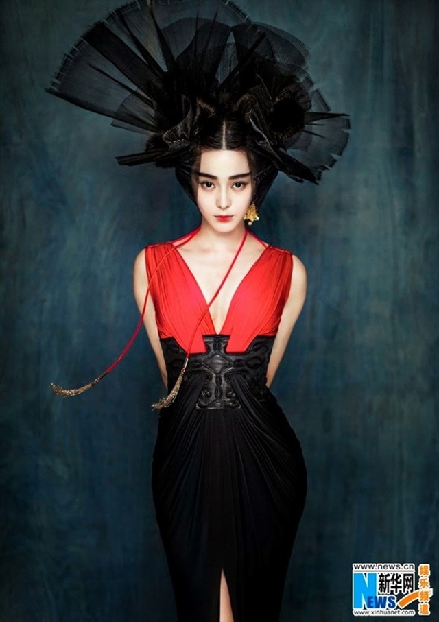 Chiếc đầm ren đỏ càng làm cho làn da trắng nõn nà của Phạm Băng Băng nổi hơn trong shoot hình