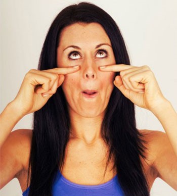 Bước 1: Đặt ngón trỏ dưới mỗi mắt, chỉ tay về phía mũi. Bước 2: Ép môi vào sát răng để tạo dáng miệng hình chữ O. Bước 3: Chớp mí mắt trên trong tư thế nhìn chằm chằm lên trần nhà trong 30 giây.