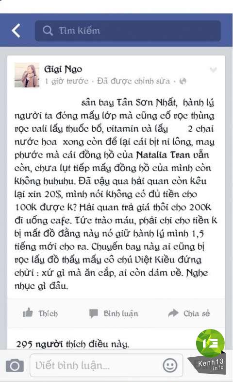 Gigi Ngo đã viết như sau trên FB của mình: “… sân bay Tân Sơn Nhất, hành lý người ta đóng mấy lớp mà cũng cố rọc thùng rọc vali lấy thuốc bổ, vitamin và lấy 2 chai nước hoa xong còn để lại cái bịt ni lông, may phước mà cái đồng hồ của Natalia Tran vẫn còn, chưa lụt tiếp mấy đồng hồ của mình còn không huhuhu. Đã vậy qua hải quan còn kêu lại xin 20$, mình nói không có đủ tiền cho 100k được k? Hải quan trả giá thôi cho 200k đi uống cafe. Tức trào máu, phải chi cho tiền k bị mất đồ đằng này nó giữ hành lý mình 1,5 tiếng mới cho ra. Chuyến bay này ai cũng bị rọc lấy đồ thấy mấy cô chú Việt Kiều đứng chửi : xứ gì mà ăn cắp, ai còn dám về. Nghe nhục gì đâu.”