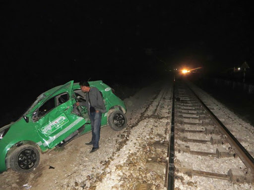 Lúc rẽ vào đường ngang dân sinh, chiếc taxi chở 3 hành khách bị mắc kẹt vào đường ray. Đúng lúc này tàu SE2 lao tới, tài xế vội vàng hô khách mở cửa thoát ra ngoài.