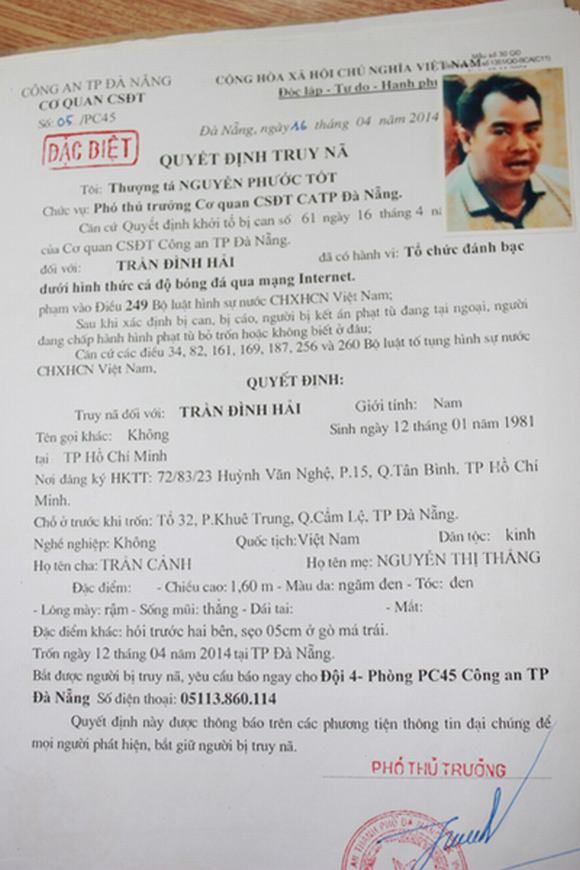 Sáng ngày 12/4, hàng chục “chân rết” trong đường dây cá độ này bị bắt quả tang khi đang tiến hành thực hiện giao dịch cá cược qua mạng. Tuy nhiên “tổng chính” Trần Đ́nh Hải đă nhanh chân bỏ trốn và bị Cơ quan Cảnh sát điều tra Công an TP.Đà Nẵng phát lệnh truy nă đặc biệt trên toàn quốc.