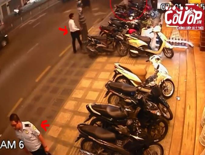 Bảo vệ quay lưng đi không hay biết vụ việc, thanh niên áo trắng dường như nhận ra hành động của tên trộm, lúc này đã phá khóa xong chiếc xe tay ga đắt tiền.