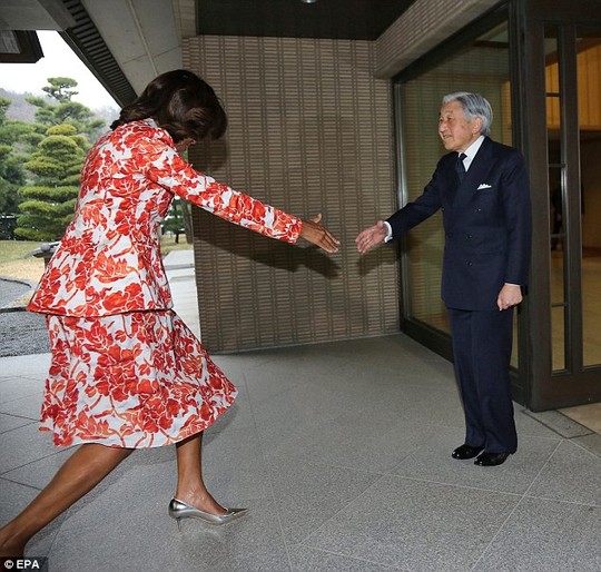Bà Michelle vẫn giữ phong độ về phong cách thời trang tuyệt vời của mình trong chuyến thăm Nhật Bản này khi diện bộ đồ hoa vừa lịch sự vừa rực rỡ. Đôi giày cao gót màu bạc cũng tôn lên sự duyên dáng của đệ nhất phu nhân Mỹ, song vô tình lại khiến bà Michelle mất tự nhiên khi diện kiến Nhật Hoàng Akihito. Dù Nhật hoàng tỏ ra rất thoải mái và mỉm cười lịch thiệp, bà Michelle có vẻ gượng gạo cúi xuống và khụy gối để bắt tay – dường như để cố gắng không để vấn đề khác biệt chiều cao ảnh hưởng tới cuộc gặp.