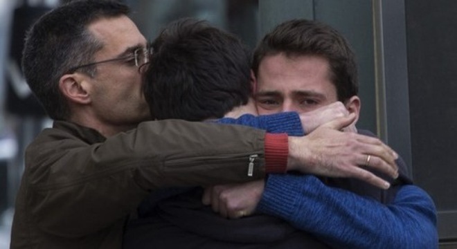 Người nhà nạn nhân trên chuyến bay xấu số 4U9525 an ủi nhau sau khi nhận hung tin.