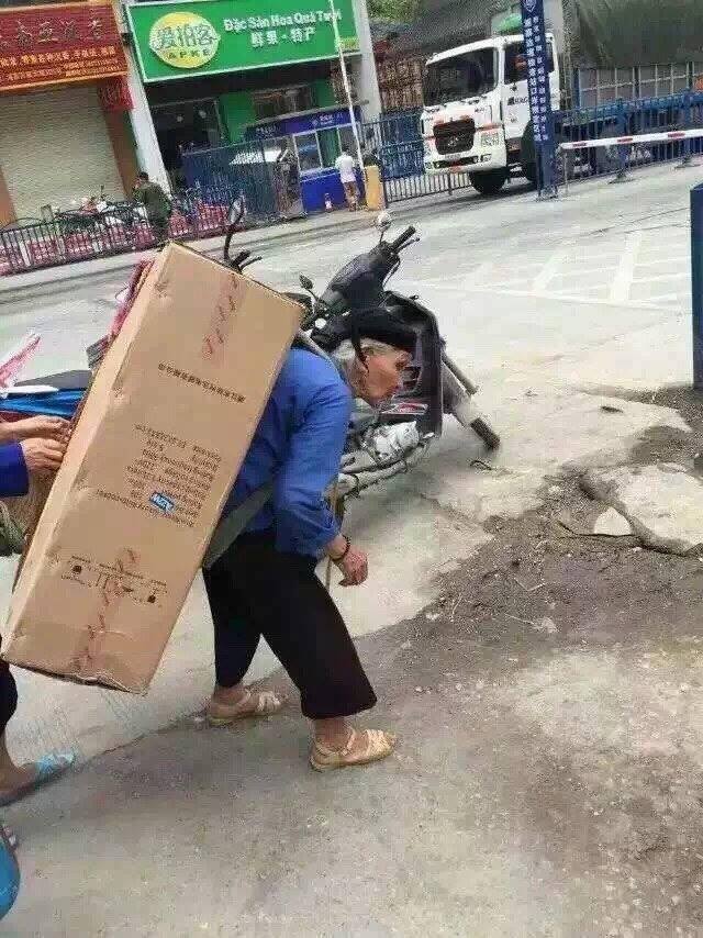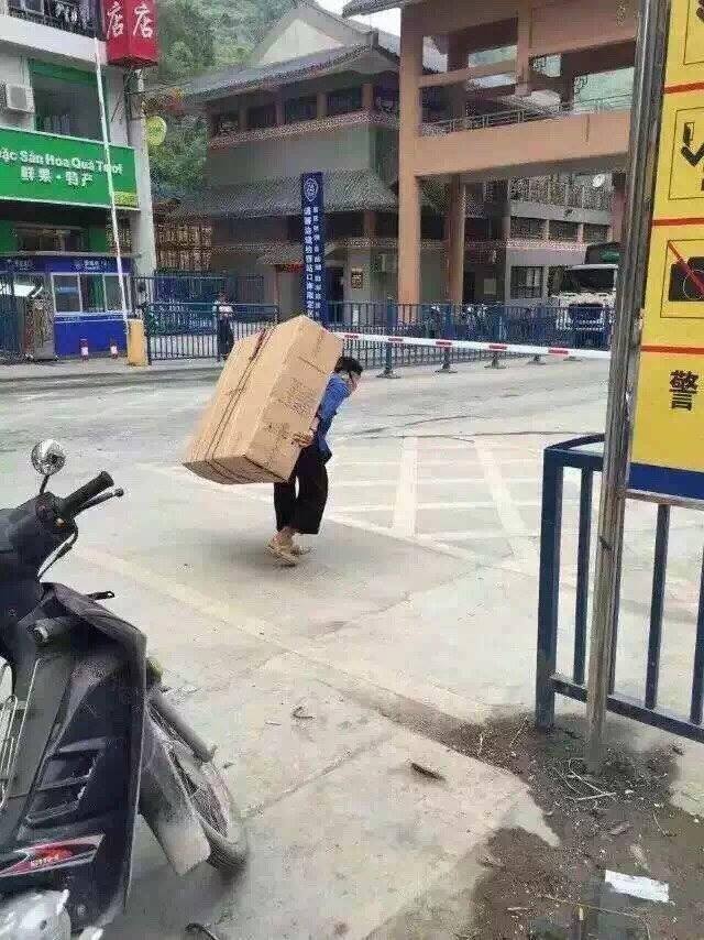H́nh ảnh một người Trung Quốc chụp lại khi một cụ già gồng gánh hàng hóa trên lưng để mang sang Việt Nam. Cũng chỉ v́ chế độ đ̣a đầy mà nhiều người Việt hiện nay đang sống rất khổ sở như vậy.