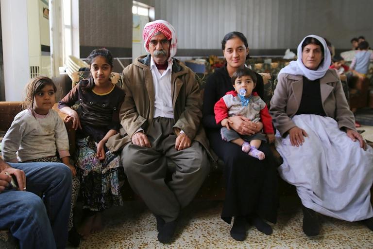 Freya Azam Ali (thứ hai từ phải sang) ngồi cùng vưois gia đình tại trại tị nạn ở Khanake, Duhok, Iraq, hai tuần sau khi trốn thoát khỏi khu vực do IS cai quản.