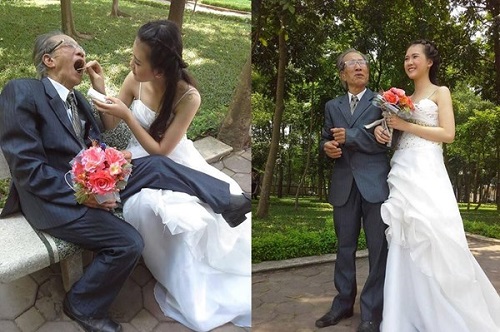 Ảnh cưới cụ ông và cô gái trẻ như học sinh ở Việt Nam