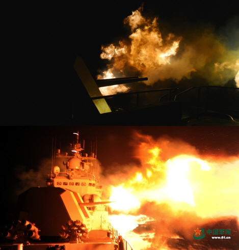 Ban ngày, Trung Quốc diễn tập phòng thủ bờ biển. Trong ảnh là hỏa pháo bắn ra từ hệ thống pháo chủ lực trên tàu chiến Trung Quốc.