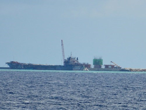 Tàu vận tải công tŕnh của Trung Quốc và một số cơ sở phi pháp do nước này xây dựng ở quần đảo Trường Sa của Việt Nam - Ảnh: Mai Thanh Hải
