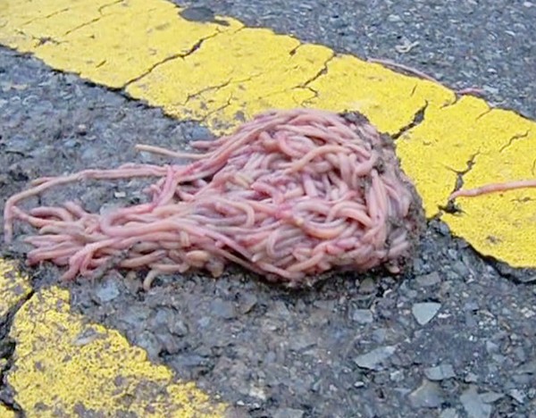 Mới đây, các nhân viên kiểm lâm đã phát hiện những ụ đất tròn nhỏ nằm giữa một con đường tại bang Texas (Mỹ) sau một cơn bão. Sau khi tiến lại gần kiểm tra, họ nhận ra các ụ này chứa rất nhiều giun đất cuộn tròn và hòa lẫn vào với nhau.