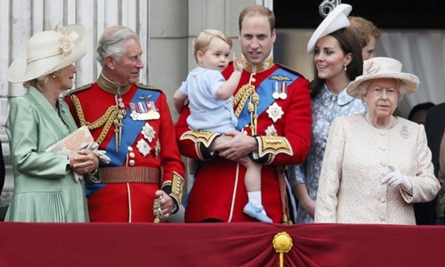 Nữ hoàng Elizabeth cùng các thành viên trong gia đình đứng trên ban công Điện Buckingham sau khi theo dõi lễ diễu binh mừng sinh nhật bà. Ảnh: Reuters