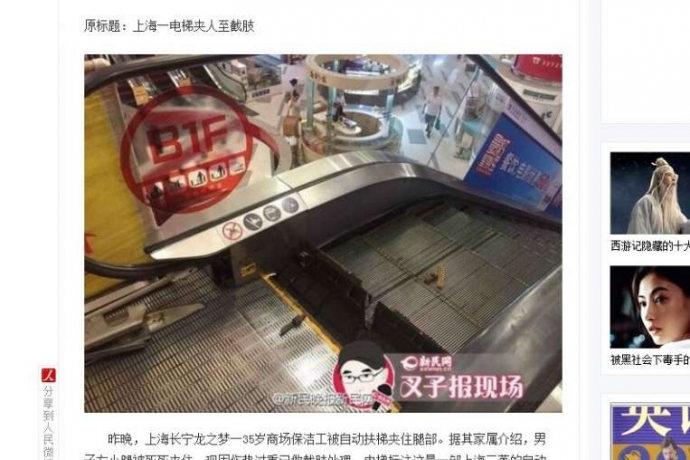 Đầu tuần rồi, bà mẹ 1 con Xiang Luijuan, 30 tuổi đã tử vong tại chỗ khi đế đặt chân thang cuốn sập và “nuốt chửng” nạn nhân tại trung tâm thương mại Jingzhou tỉnh Hồ Bắc. Ba ngày sau, một bé trai 1 tuổi bị thang cuốn nghiền náy một tay tại một trung tâm thương mại tỉnh Quảng Tây.