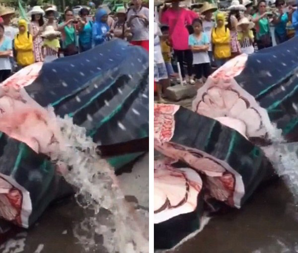 Con cá mập voi đang thoi thóp trên mặt đất bị 2 người đàn ông cầm cưa đem xẻ thịt. Dù con cá vẫn đang thở, nhiều người đứng xung quanh cũng mặc kệ và chờ đến lượt mình nhận thịt… Vụ việc xảy ra ở Trung Quốc, đúng là bọn dã man