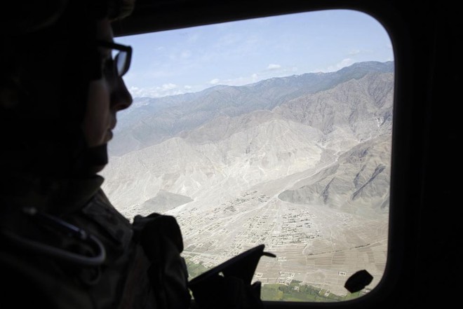 Một nữ binh sĩ Mỹ nhìn ra từ cửa sổ trực thăng vận chuyển quân và công nhân Mỹ tới các căn cứ quân sự ở tỉnh Kunar, phía tây Afghanistan.