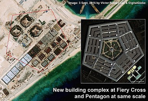 Tờ Diplomat đăng tải những hình ảnh cho thấy tổ hợp mà TQ xây dựng có phần móng rộng 61.000 mét vuông, chưa bao gồm vùng lân cận rộng lớn xung quanh. Trong khi so sánh với móng của Lầu Năm Góc là 116.000 mét vuông chưa bao gồm sân trong.