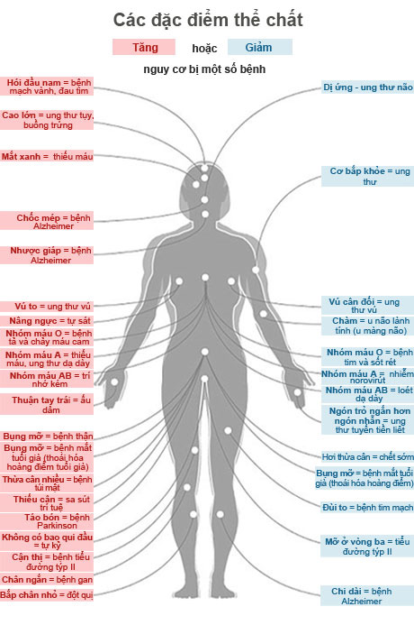 Hình đồ họa thể hiện một số đặc điểm thể chất làm tăng nguy cơ một số bệnh (màu đỏ) trong khi một số khác lại làm giảm nguy cơ (màu xanh). Nó cho thấy chốc mép có liên quan với tăng nguy cơ bệnh Alzheimer, trong khi chân tay dài có liên quan với giảm nguy cơ sa sút trí tuệ.