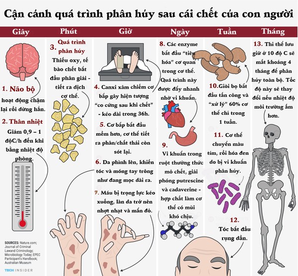 Nhưng bạn đã bao giờ tự hỏi, điều gì sẽ xảy ra sau khi bạn qua đời? Cơ thể chúng ta sẽ có những phản ứng gì sau khi chết và quá trình phân hủy của cơ thể sẽ diễn ra như thế nào. Infographic dưới đây sẽ bật mí cho bạn biết quá trình đó.