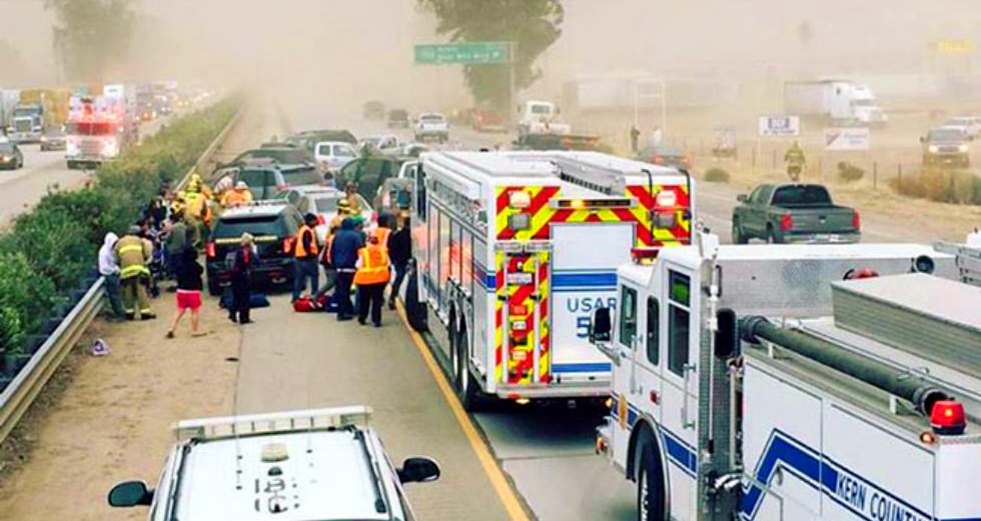Tại phía nam của thung lũng San Joaquin, gió thổi quá mạnh khiến đất cát từ các nông trại thổi tràn qua xa lộ, làm cho các tài xế không thấy đường và tông vào nhau.