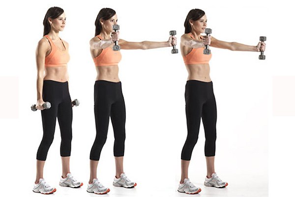 Đứng thẳng với chân mở rộng bằng vai, đầu gối hơi cong, cơ bụng co vào. Giữ mỗi bên một quả tạ bằng tay tại độ cao bằng vai, lòng bàn tay hướng ra ngoài khi gập cong khuỷu tay lại.