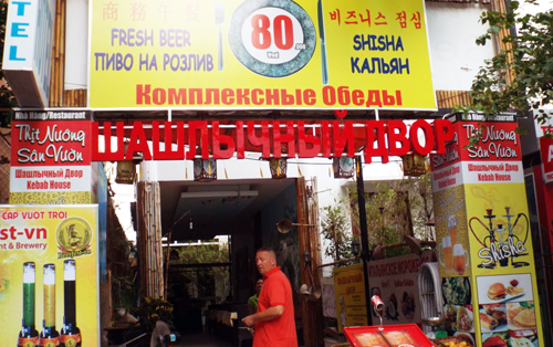 Cửa hàng ăn uống đường Hùng Vương ở khu phố Tây, TP Nha Trang, ngập tràn tiếng Trung Quốc và Nga. Ảnh: N.X