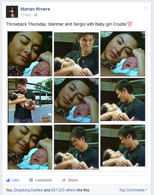 Đi kèm với bức ảnh, Marian Rivera viết: "Throwback Thursday: Marimar and Sergio with Baby girl Cruzita". Trên thực tế hai Marimar và Sergio là tên hai nhân vật chính mà Marian và Dingdong thủ vai trong bộ phim truyền hình nổi tiếng Vũ điệu hoang dã. Các fan rất thích thú khi chứng kiến cái kết đẹp của cặp đôi ngoài đời thực.