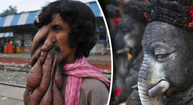 Kanai Das, 42 tuổi, sống ở Baruipur, Ấn Độ bị mắc một chứng bệnh hiếm gặp khiến cho khuôn mặt anh ta chảy xệ xuống như một chiếc vòi voi.