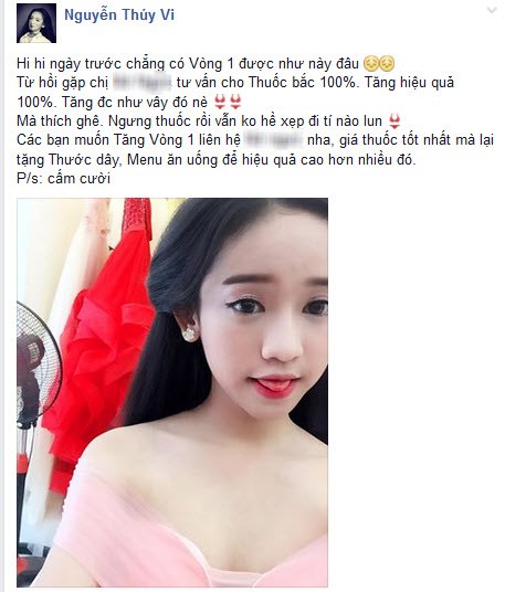 Được biết, đây là status Thúy Vi nhằm quảng cáo cho một thương hiệu thuốc nở ngực. Sau khi nổi đình nổi đám vì những tai tiếng của mình và sở hữu gần 200.000 lượt người theo dõi Facebook cá nhân, Thúy Vi đã tranh thủ khoảng thời gian này để nhận tất tần tật các hợp đồng quảng cáo.