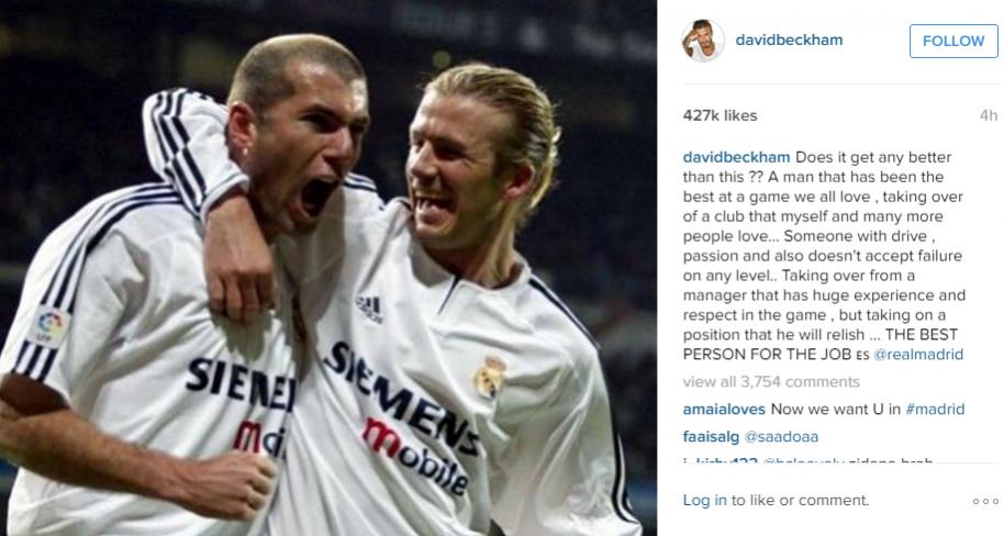 Beckham viết trên Instagram: “Có lựa chọn nào tốt hơn Zidane chăng? Đó là cầu thủ xuất sắc nhất ở một đội bóng tất cả chúng ta đều yêu mến. Một con người đầy nghị lực, đam mê và không bao giờ chấp nhận thất bại. Kế nhiệm một HLV đầy kinh nghiệm để ngồi vào chiếc ghế nóng ở Bernabeu, Zidane là người phù hợp nhất cho công việc đó.”