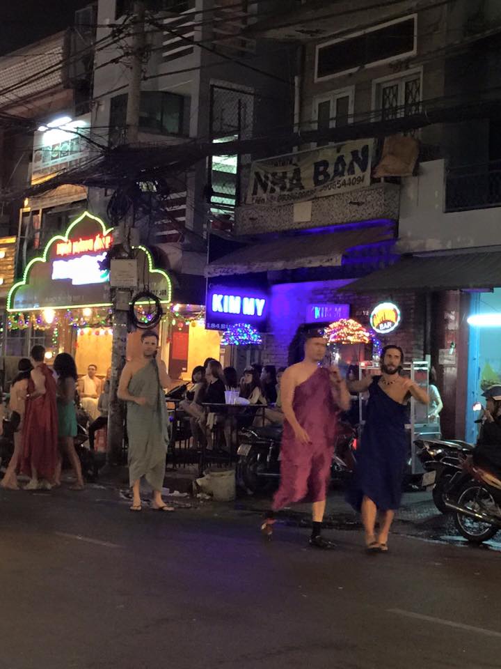 Con phố Tây nổi tiếng Bùi Viện đã khá quen thuộc đối với những du khách nước ngoài khi sang Việt Nam. Tuy nhiên mới đây, con phố này đã trở nên sôi động hơn với sự xuất hiện của một nhóm khách nam người nước ngoài. Họ mặc những trang phục “nữ thần Hy Lạp” rất độc và lạ khiến nhiều người không nhịn nổi cười.