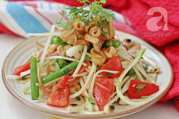 Giờ đây bạn không còn phải cảm thấy lo ngấy khi phải ăn nhiều những đồ chiên, xào, rán nếu trong mâm nhà bạn bổ sung thêm đĩa gỏi đu đủ mực rim đầy màu sắc như dưới đây. Món ăn này có thể bổ sung vào thực đơn ăn locab của bạn mà vẫn đảm bảo được dinh dưỡng cho gia đình nữa đấy.