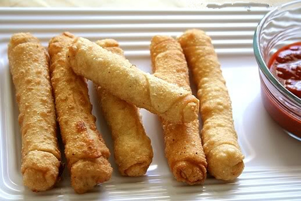 Gấp 2 mép tấm bột lại rồi cuốn tròn bánh lại. Phần mép cuối tấm bột bạn có thể quét một ít nước để gấp mép dính vào dễ dàng hơn. Bạn làm tương tự với phần bột và nhân còn lại. Cuối cùng bạn cho bánh vào chiên trong dầu nóng đến khi bánh chín vàng đều là được.