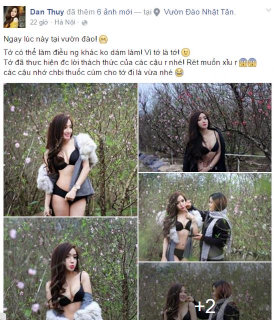 Mới đây, cô nàng Đan Thùy đã post lên facebook cá nhân loạt ảnh kèm dòng trạng thái: "Ngay lúc này tại vườn đào! Tớ có thể làm điều người khác không dám làm! Vì tớ là tớ! Tớ đã thực hiện đc lời thách thức của các cậu rồi nhé! Rét muốn xỉu rồi, các cậu nhớ chuẩn bị thuốc cúm cho tớ đi là vừa nhé!"