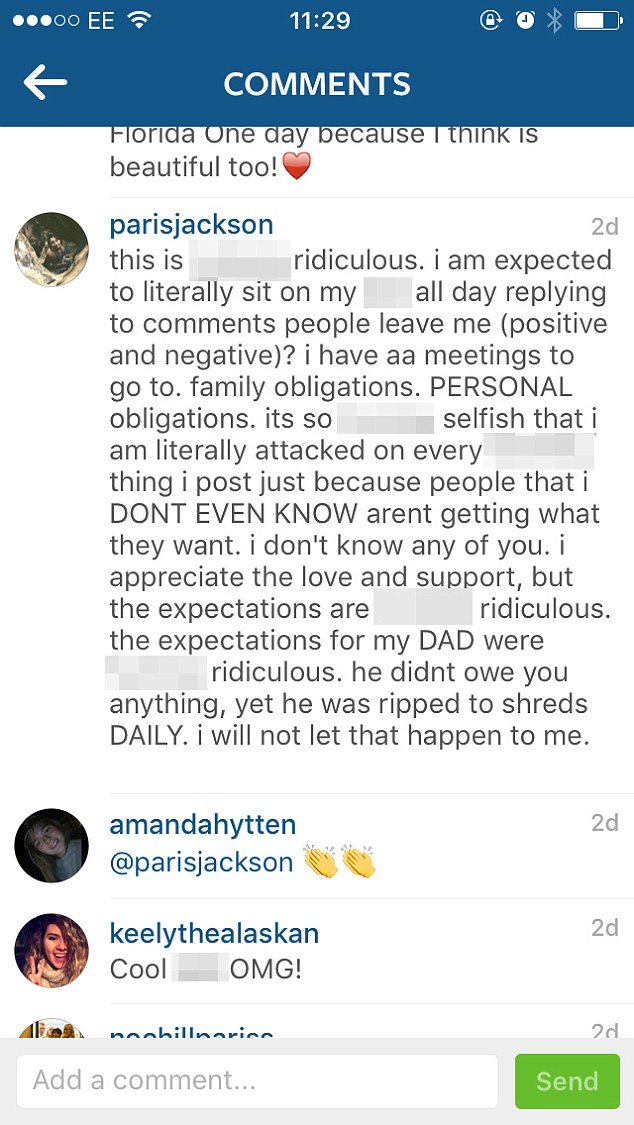 Trong một phần bình luận khác, Paris Jackson tỏ ra mệt mỏi: "Tôi chỉ là một con người bình thường. Tôi đã cố gắng trả lời bình luận của các bạn, nhưng tất cả vẫn không đủ. Cho nên tôi quyết định không làm gì nữa."