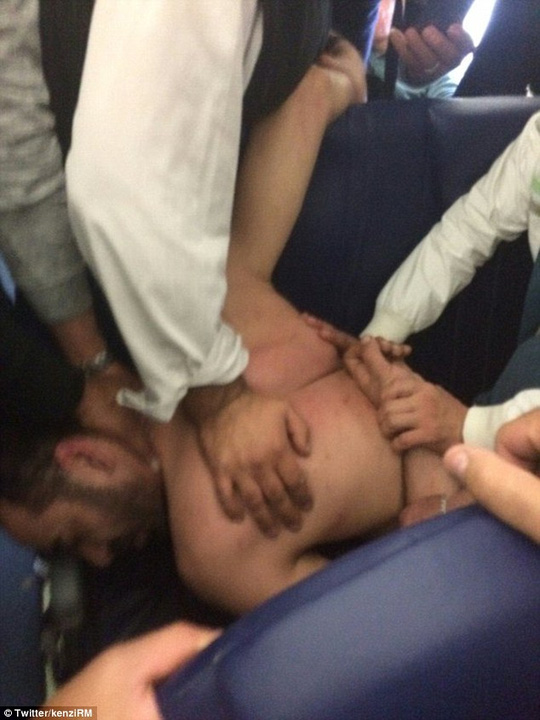 Các tiếp viên khống chế người đàn ông bất lịch sự. Ảnh: Twitter