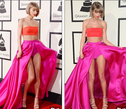 Cũng trong vài năm gần đây, nữ ca sĩ Taylor Swift luôn là "nữ hoàng thảm đỏ Grammy" nhờ nhiều sự lựa chọn trang phục khá cá tính phù hợp với thân hình mảnh mai và vẻ đẹp kiêu kỳ của mình. Năm nay, cô tiếp tục gây chú ý tại Grammy với bộ đồ của Versace gồm áo chẽn ngắn màu cam phối cùng chân váy hồng hoa mười giờ xẻ giữa, để lộ quần chip đồng màu. Set đồ của cô được phối theo phong cách colour-block.