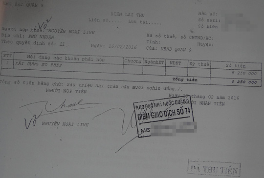 Biên lai đóng phạt của Hoài Linh liên quan đến việc xây nhà không phép