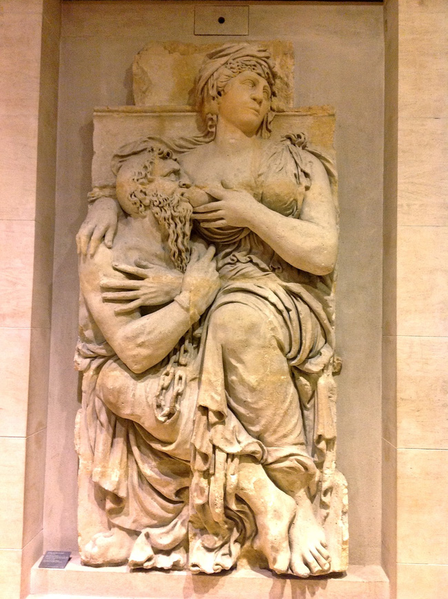 Ở bảo tàng nghệ thuật Lourve có một bức điêu khắc của Jean Goujon khiến những người lần đầu đi qua đều phải đỏ mặt xấu hổ khi nhìn vào. Đó là bức tượng một cô gái trẻ đang vạch bầu ngực cho gã đàn ông già nua bú. Không chỉ ở Lourve mà còn nhiều bảo tàng khác trên thế giới có những tấm điêu khắc, tranh vẽ về hai nhân vật này.