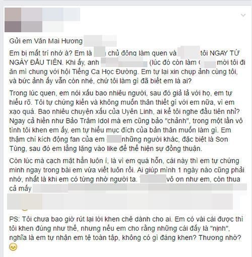 "Gửi em Văn Mai Hương. Em bị mất trí nhớ à? Em là người chủ động làm quen tôi ngay từ ngày đầu tiên. Khi ấy, anh H mời tôi đi ăn mì chung với hội Tiếng Ca Học Đường. Em tự lại xin chụp ảnh cùng tôi, và bức ảnh ấy vẫn còn nhé, chứ tôi làm gì đã biết em là ai?