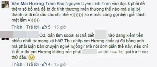 Ngay sau đó, Văn Mai Hương đề xuất một cuộc hẹn với hot blogger này để nói chuyện rõ ràng. Cô cũng tag cả Uyên Linh, Bảo Trâm vào để "khỏi phải gọi điện thanh minh là em nói xấu mọi người".
