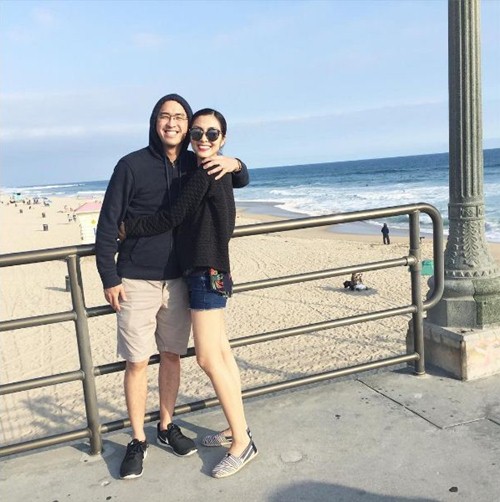 Hà Tăng ôm chồng và cười rạng rỡ tại bờ biển của Mỹ.