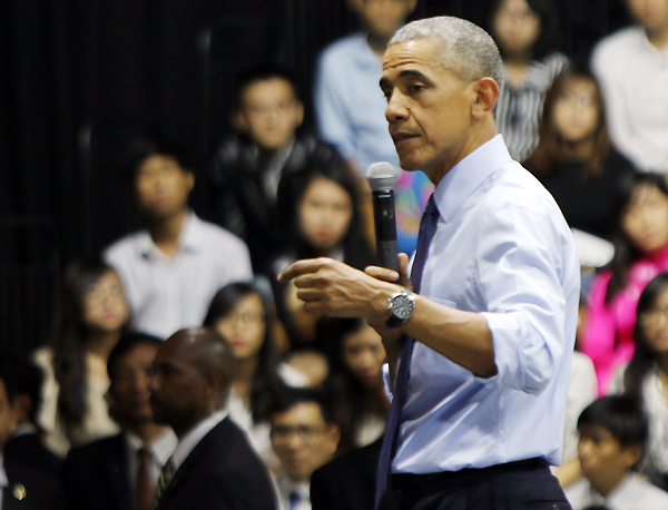 Tổng thống Mỹ trong buổi tṛ chuyện với giới trẻ Việt Nam sáng nay.