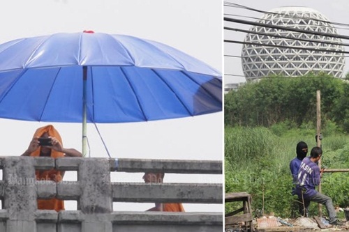 Trong khi các sĩ quan DSI tìm cách đạt thỏa thuận bắt giữ sư trụ trì chùa Dhammakaya, các nhà sư giám sát khu chùa từ một cây cầu, còn nhân viên tại hiện trường của DSI xem xét từ cái đồng cạnh chùa. Ảnh: BangkokPost