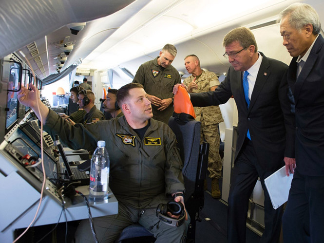Bộ trưởng Quốc pḥng Mỹ Ashton Carter Bộ trưởng Quốc pḥng Singapore NG Eng Hen trên máy bay tuần biển và săn ngầm của Hải quân Mỹ bay trên Singapore và eo biển Malacca ngày 3.6.2016