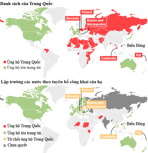 Sự khác nhau trong danh sách của Trung Quốc và tuyên bố các nước về lập trường đối với vụ kiện "đường lưỡi ḅ". Đồ họa: WSJ. Xem ảnh lớn tại đây