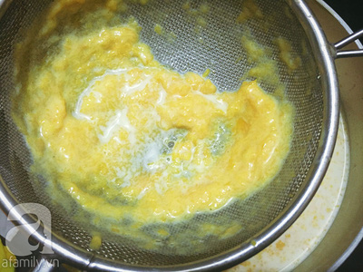 Xoài rây qua rây để loại bỏ xơ rồi trộn với hỗn hợp sữa ở trên.