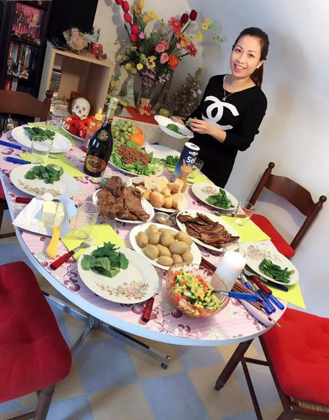 Chị Huệ bên mâm cơm gia đình trước khi mất tích