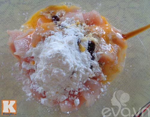 Bước 2: Cho từng miếng gà vào tô bột, lăn qua lăn lại, nắm chặt tay cho bột bán dính dầy xung quanh miếng gà.